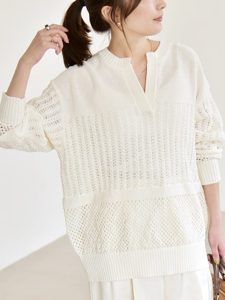 〔ONE SIZE〕quaranciel:〈手洗い可能〉透かし編み スキッパー ニット プルオーバー