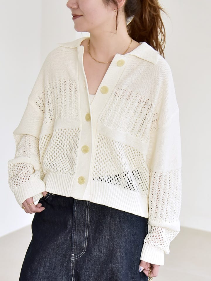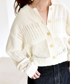 〔ONE SIZE〕quaranciel:〈手洗い可能〉透かし編み 襟付き ニット カーディガン