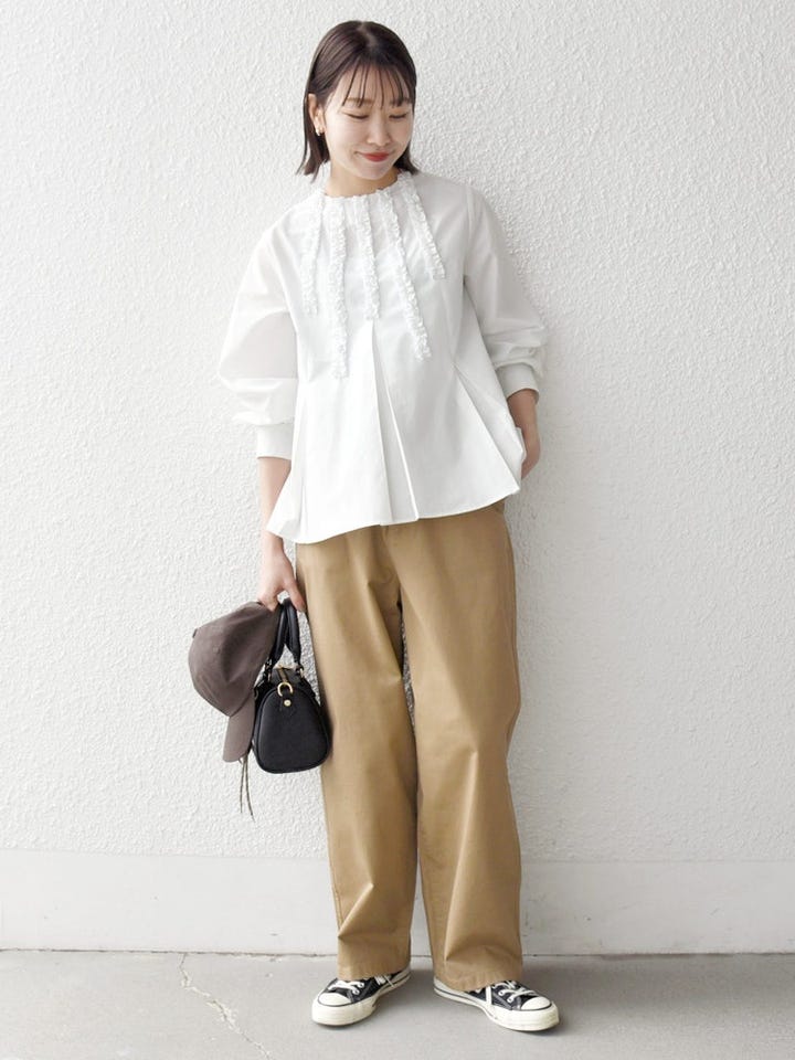 フェミニンブラウスにあえてチノパン、スニーカーで