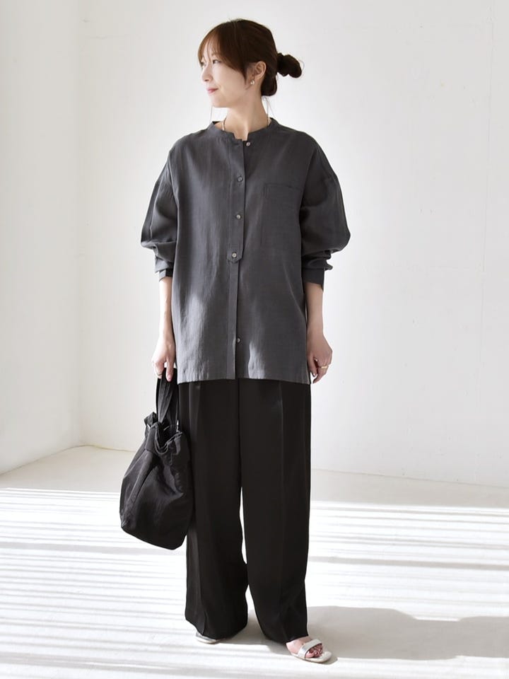 シアーシャツにブラックのワイドパンツを合わせた、ワントーンコーデ。
