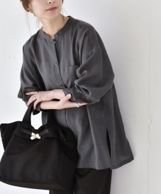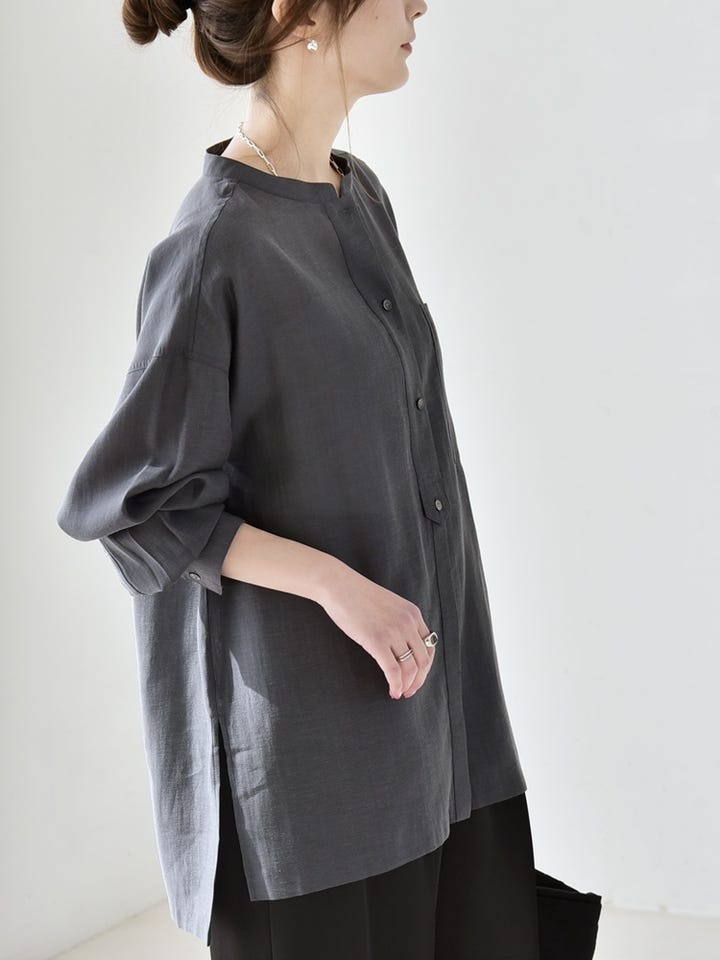 〔ONE SIZE〕《予約》quaranciel:〈洗濯機可能〉リネン ミックス バンドカラー ポケット シャツ