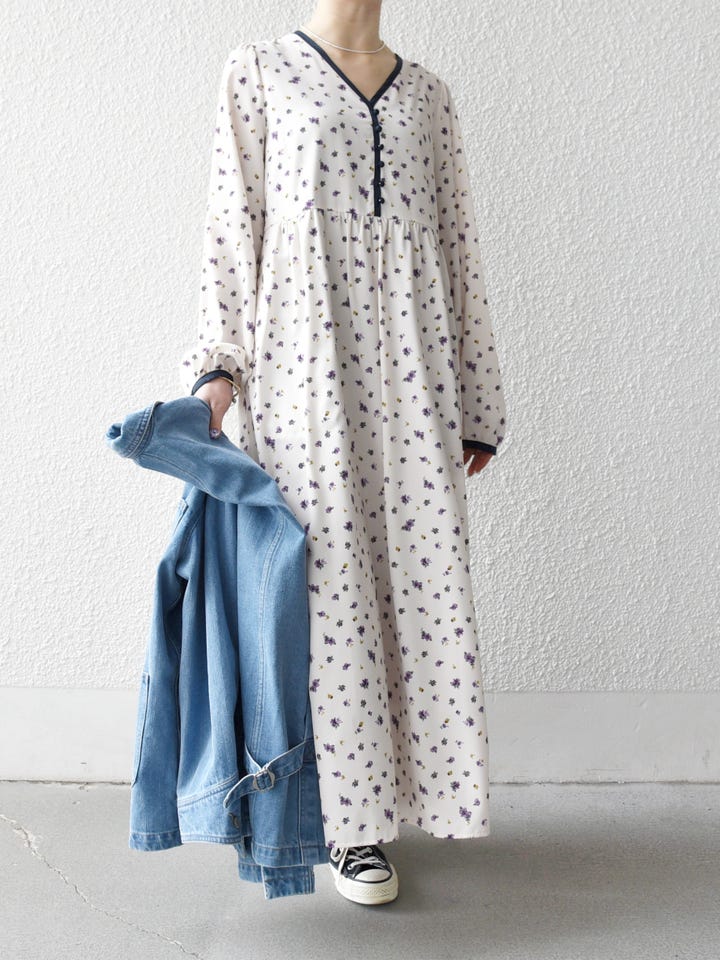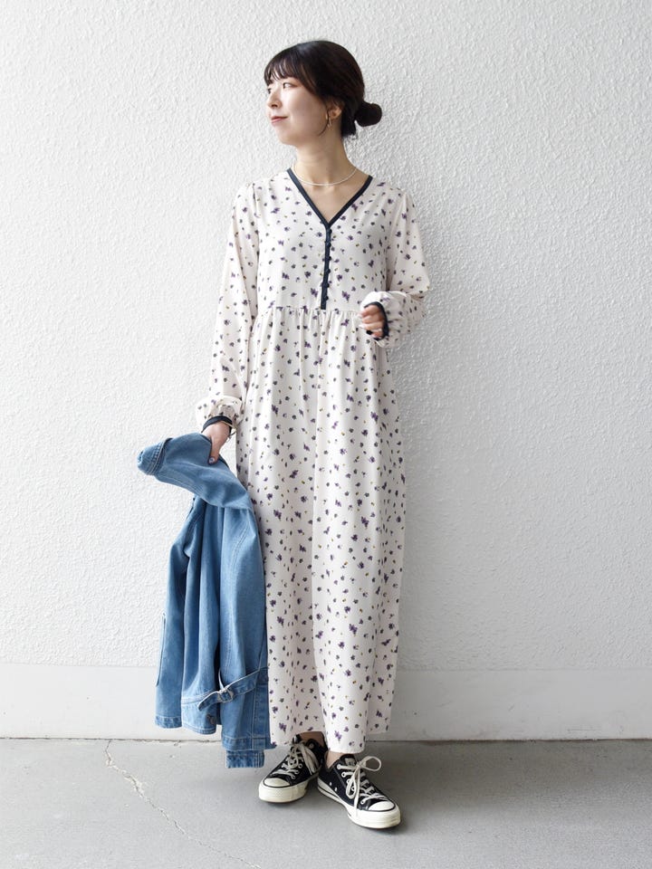 着用アイテム:SHIPS any:〈洗濯機可能〉フラワー プリント バイカラー Vネック ギャザー ワンピース