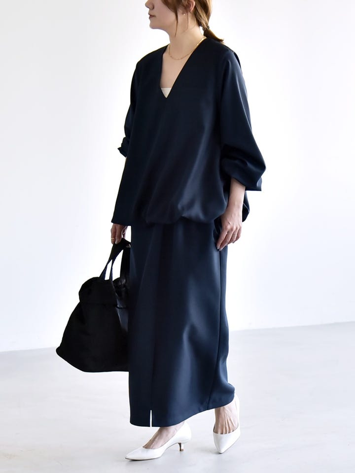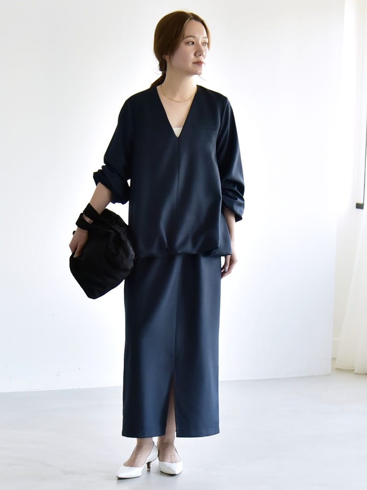 〔ONE SIZE〕《予約》quaranciel:〈洗濯機可能〉Vネック ブラウス & Iライン スカート セットアップ