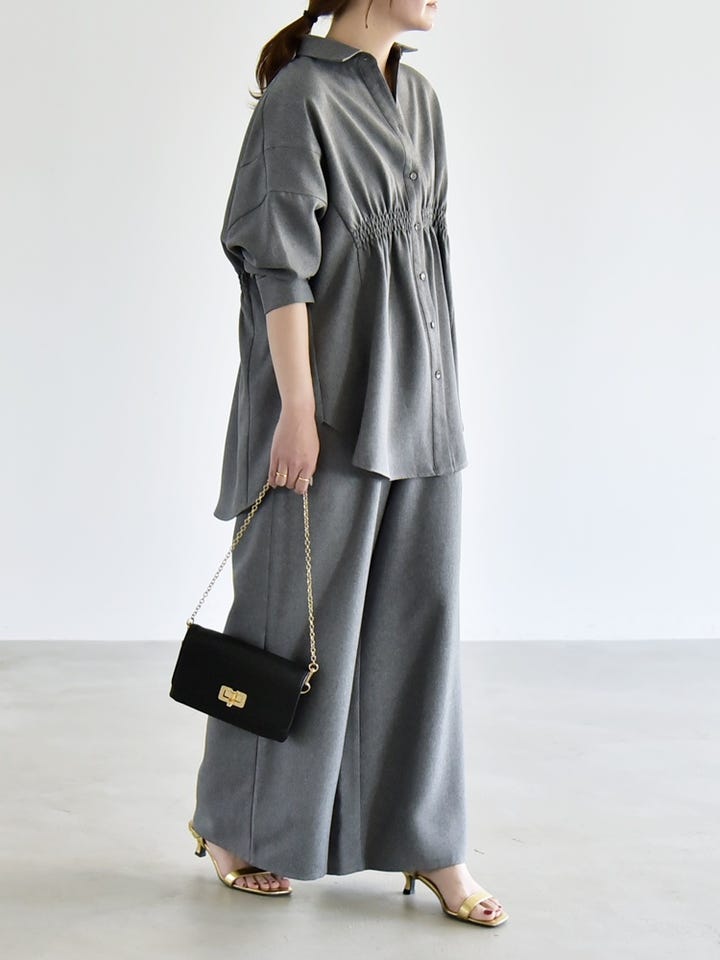 サイズ感:着丈は前後差があり、後ろはヒップがすっぽり隠れる長さ。パンツはヒールを合わせて丁度良い長さ。フラットシューズでは床すれすれくらいです。
