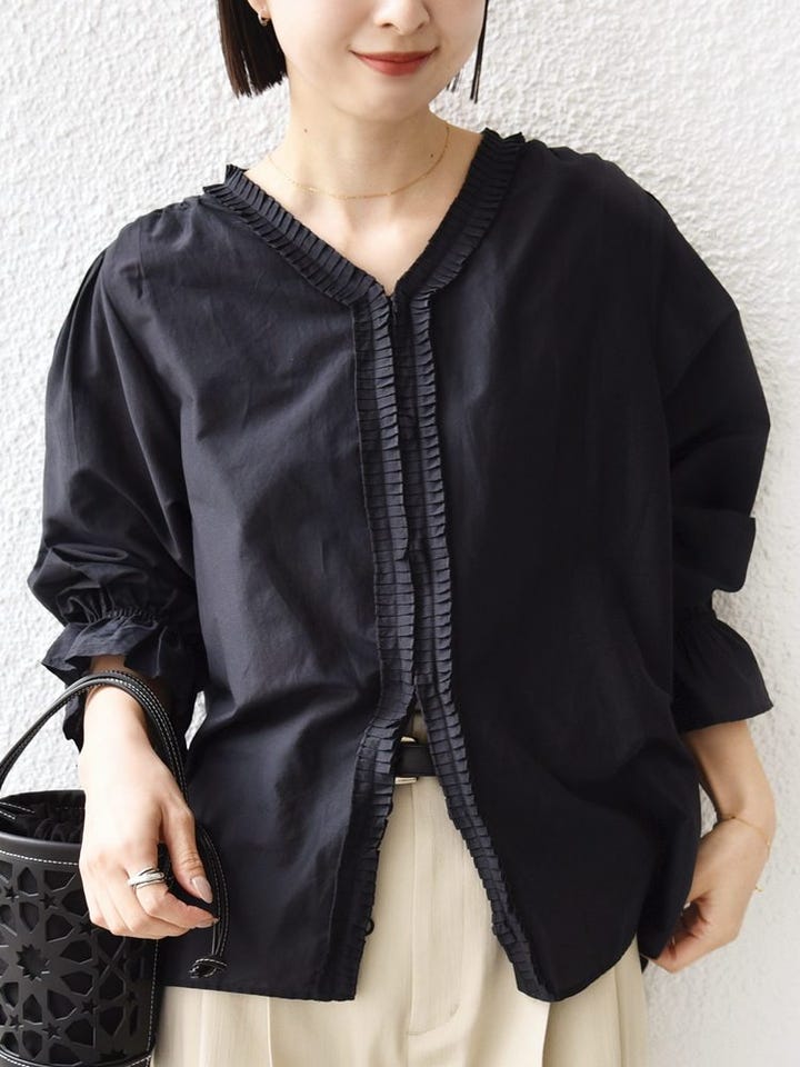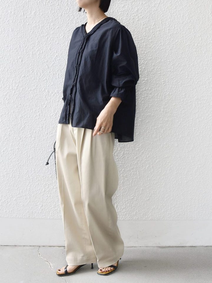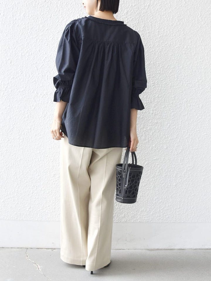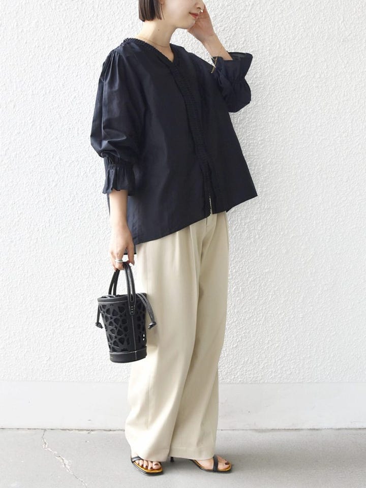 着心地:さらっとしていて軽い着心地です。Vネックで首元がスッキリ見えるので、甘くなりすぎず大人の女性にぴったりの一枚です。