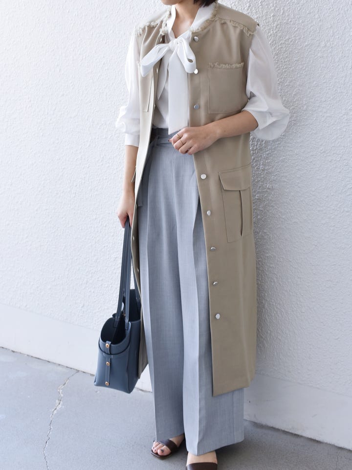 着用レビュー:ボタンを開けてジレ風に着るのも可愛いです◎ウエストをベルトで絞れるので、小柄な方にもマッチします。