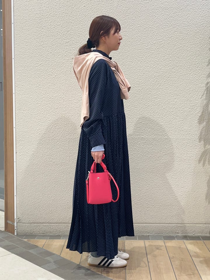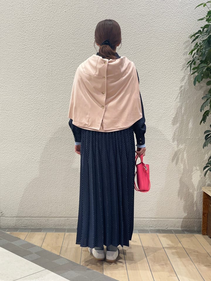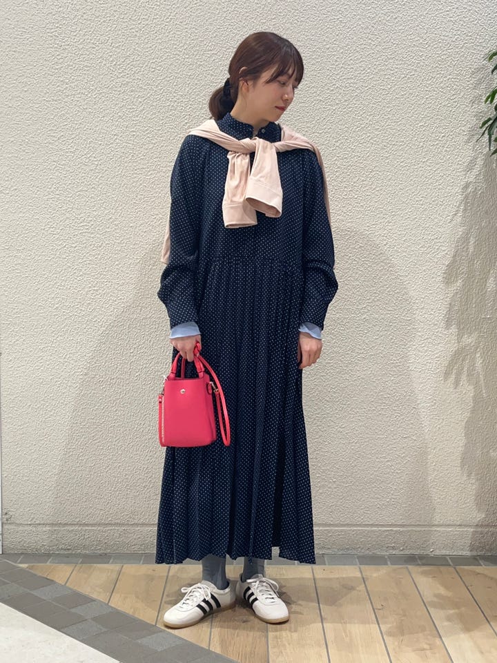 着用アイテム: ドット バンドカラー プリーツ ロング ワンピース