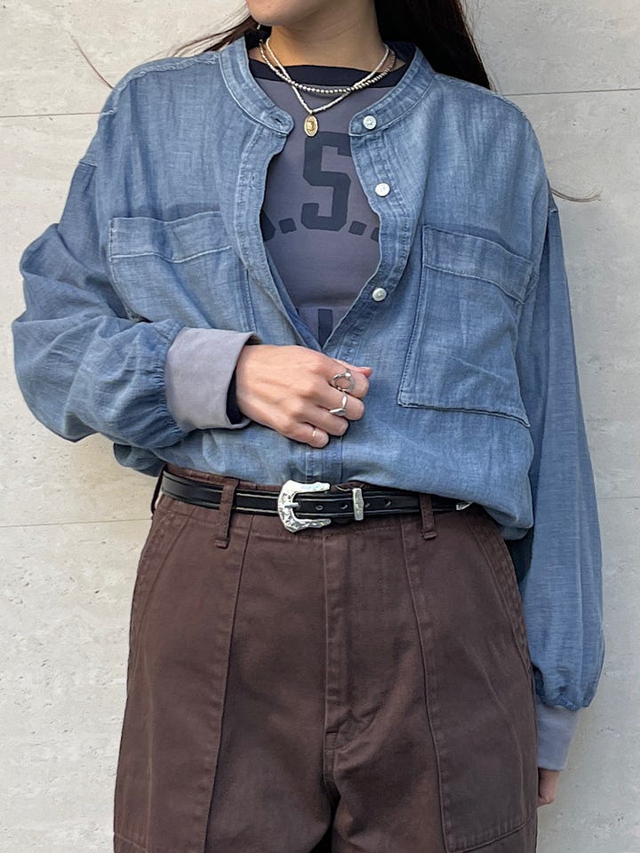 〔ONE SIZE〕〈手洗い可能〉シアー デニム 袖 リブ バンドカラー シャツ