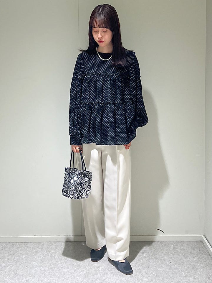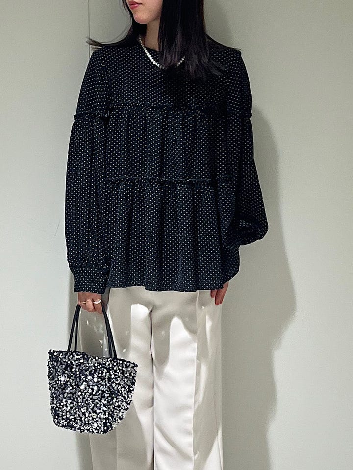 フリルは控えめで小ぶりなので上品な印象に見せてくれます。セレモニーにもおすすめです。腰回りからヒップラインあたりまでカバーしてくれるのでパンツスタイルに合わせわすい着丈です。普段だとデニム合わせでテイストミックスさせて着こなすのがおすすめです!