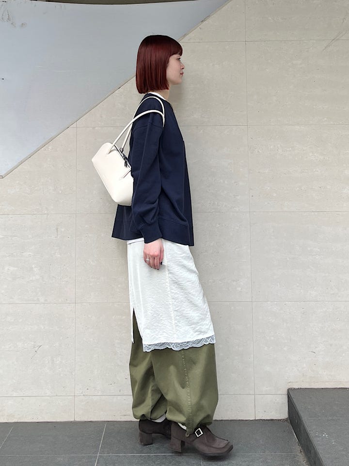 着心地:一枚だと透けるのでパンツとレイヤードさせて楽しむアイテムです。静電気も起きにくくカラーパンツ、スラックスやデニムなど幅広く対応可能な万能品です。