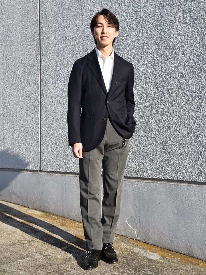 シャツとスラックスはストレッチ素材のアイテムを使用。