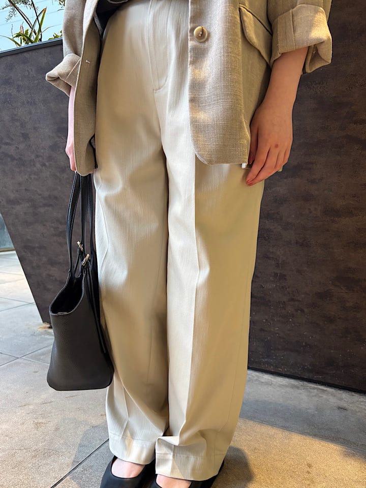 着心地 : さらっとした生地と後ろがゴムのため、ストレスなく着用できます。腰位置が高く見える2タック仕様でシルエットが綺麗に見えます。