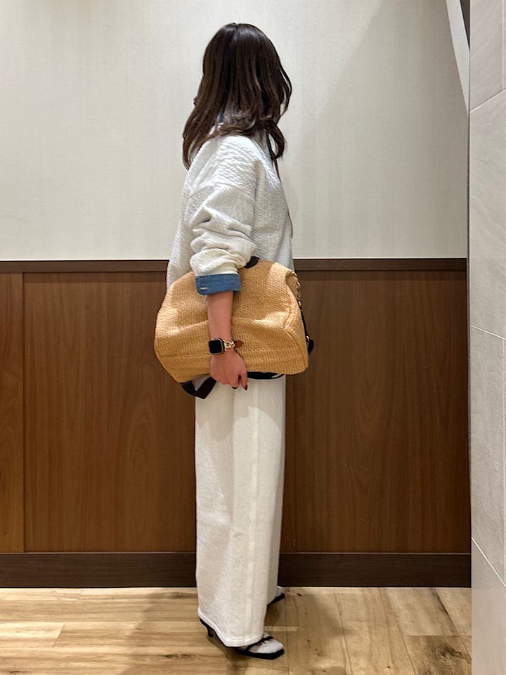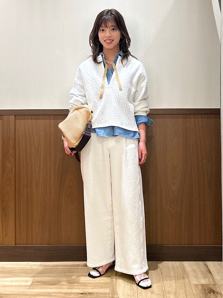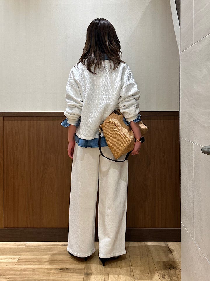 ワイドなシルエットですが縦にすっきり、脚長に見せる効果があります。