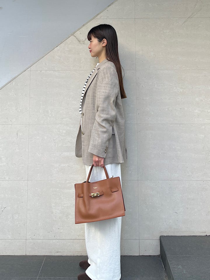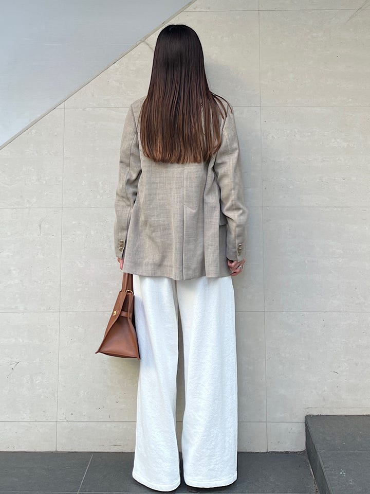 柔らかいコットン素材でとても着心地良いです。質感はカジュアルですが、形がとても綺麗でラフになりすぎないのが魅力です。