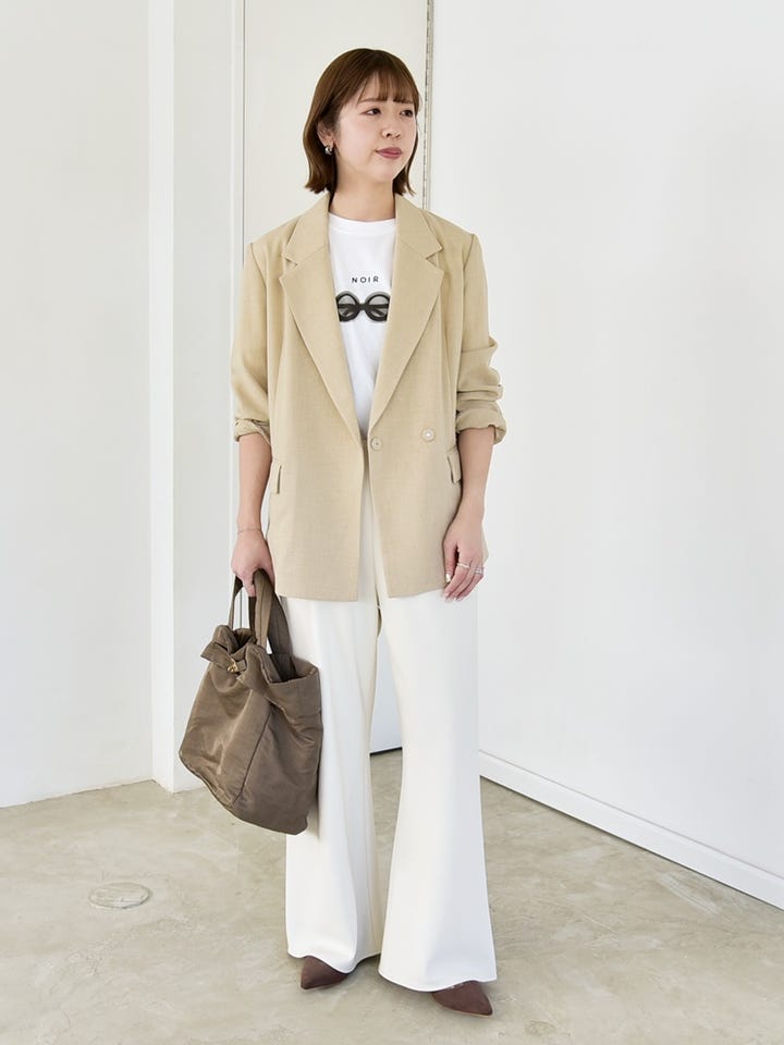 ナチュラルなベージュジャケットにロゴTを合わせた、程よく力の抜けたきれいめコーデ。