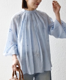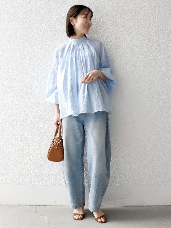 着用アイテム:シアー ドット スタンドカラー パフ ブラウス ライトブルー