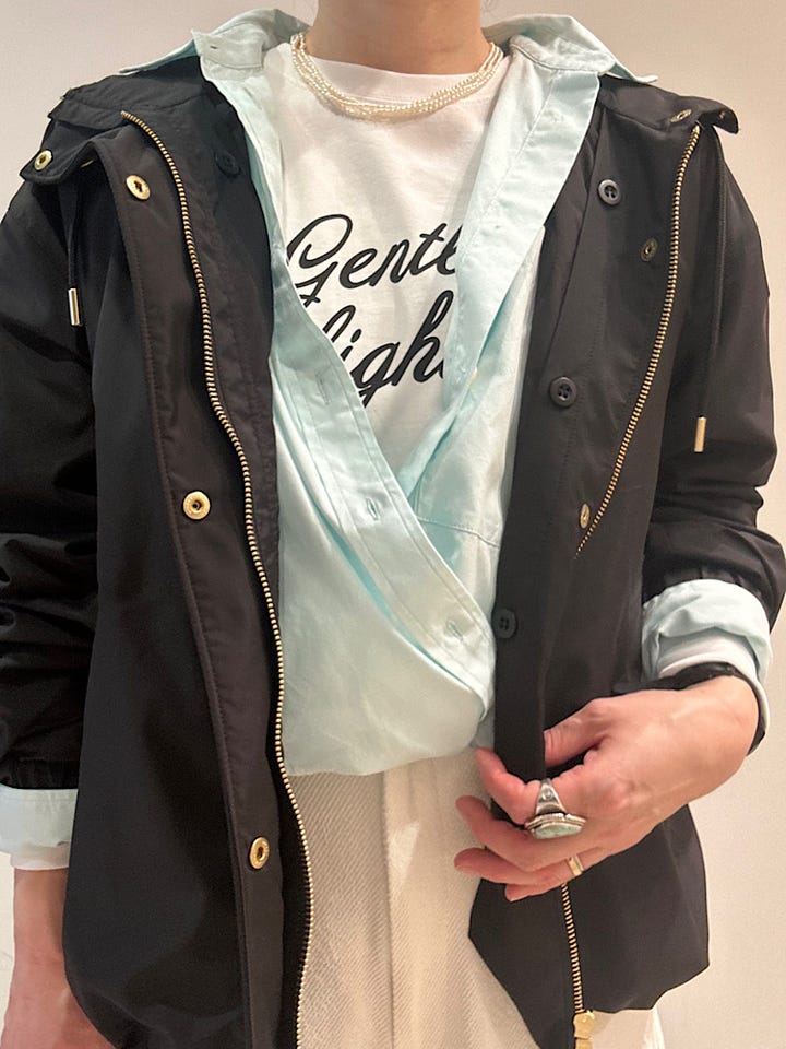 着心地:マットな光沢があり上品に着られるアウターです。ごわつきはなくサラッと羽織りやすく、たたむとコンパクトになるので季節の変わり目に重宝しそうです。