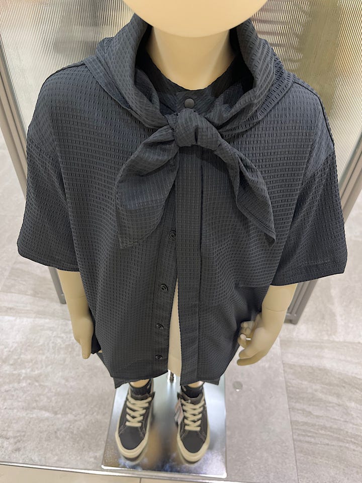 スカーフ付きのシアサッカー素材の半袖シャツとややワイド感のあるハーフパンツのセットアップ。