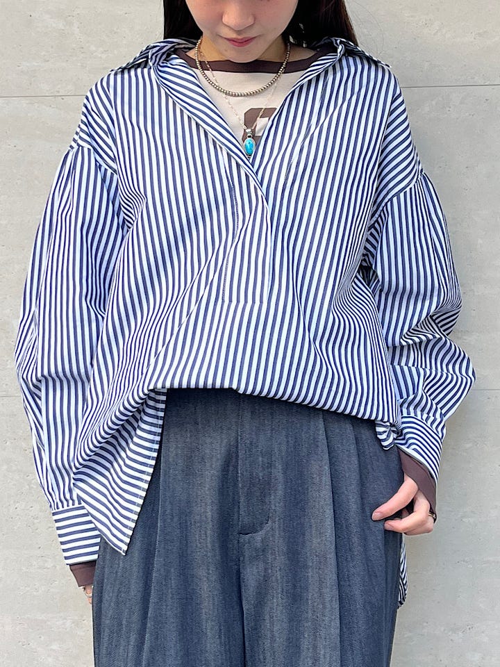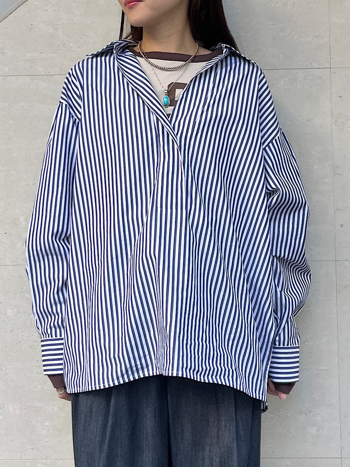 〔ONE SIZE〕〈手洗い可能〉無地 / ストライプ サイド スリット スキッパー コットン シャツ