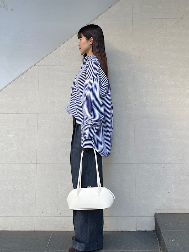 程よいボリューム感でシルエットがとても綺麗なパンツです。デニム見えする生地ですが、綺麗めのスタイルにも取り入れやすい雰囲気です。