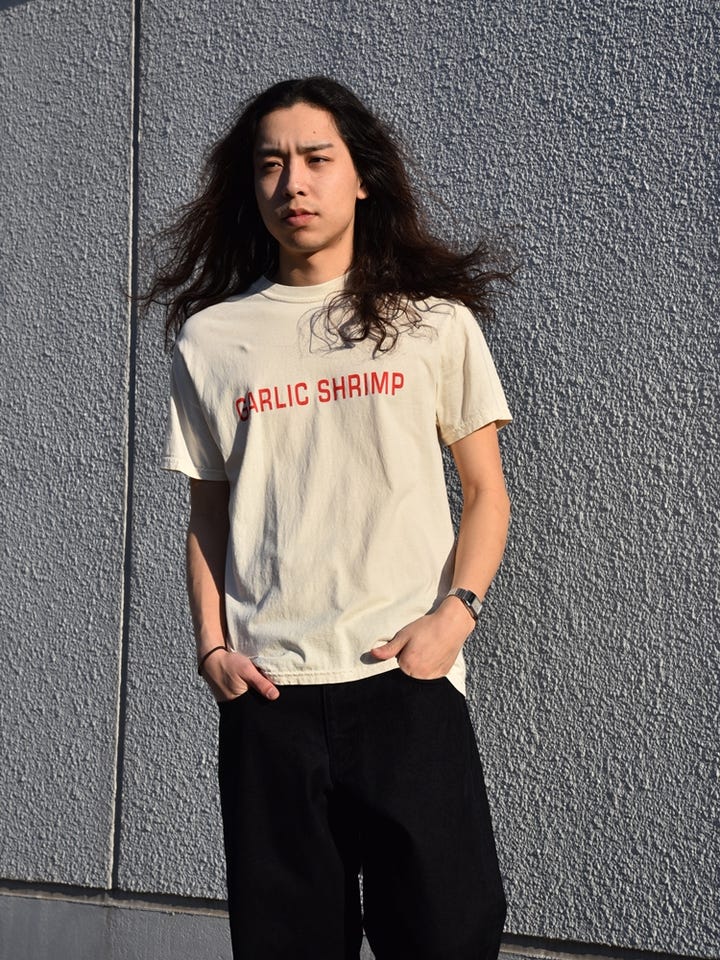 商品: ニンニクカラーのボディーにガーリックシュリンプの文字をプリント。