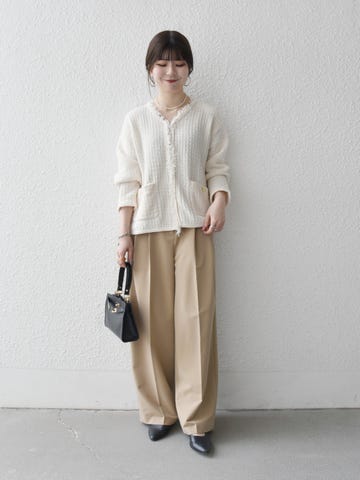 ナチュラルトーンでまとめ、小物はブラックで引き締め。