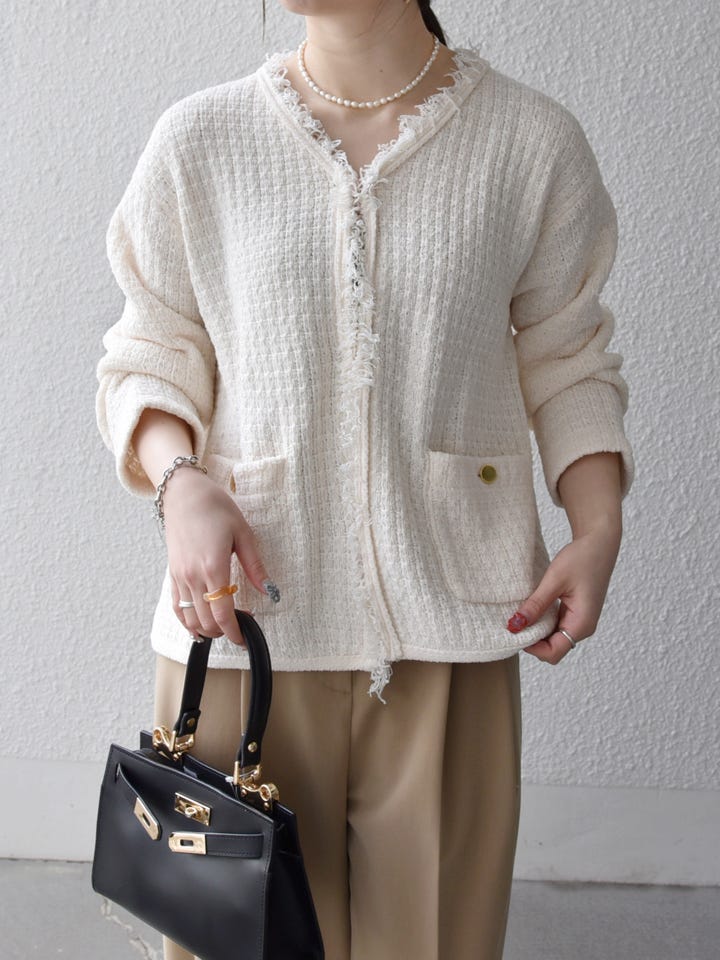 着用アイテム:SHIPS any:〈手洗い可能〉ツイード ライク フリンジ ニット ジャケット カーディガン