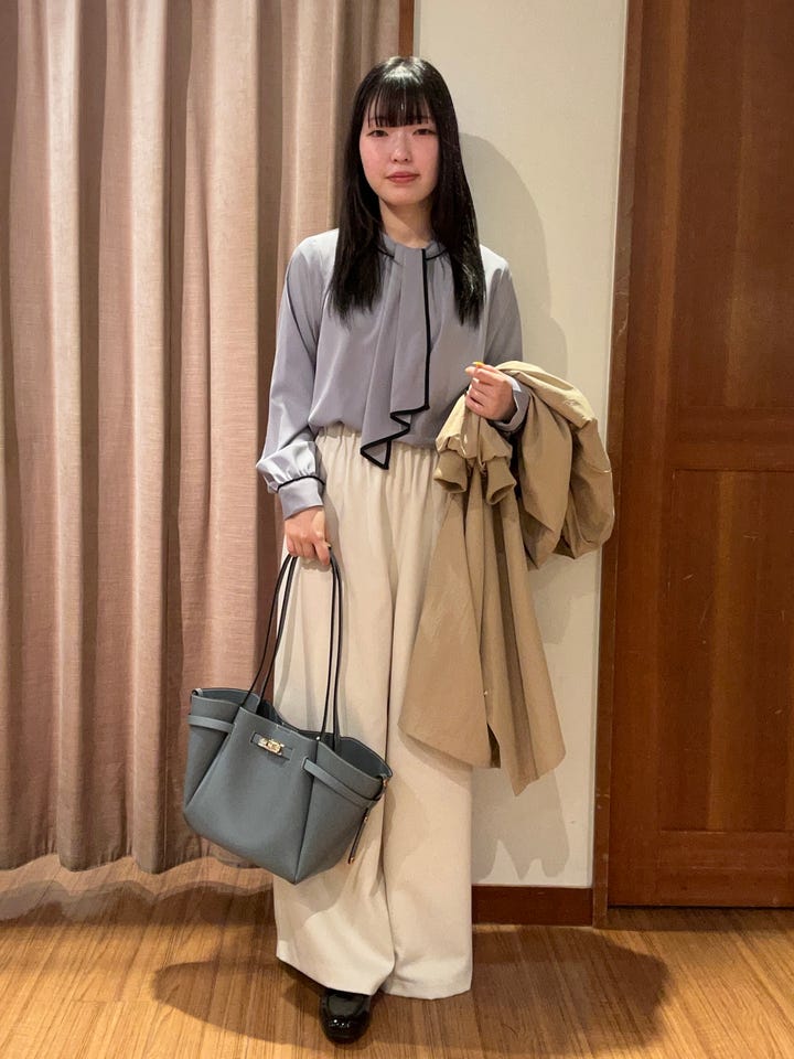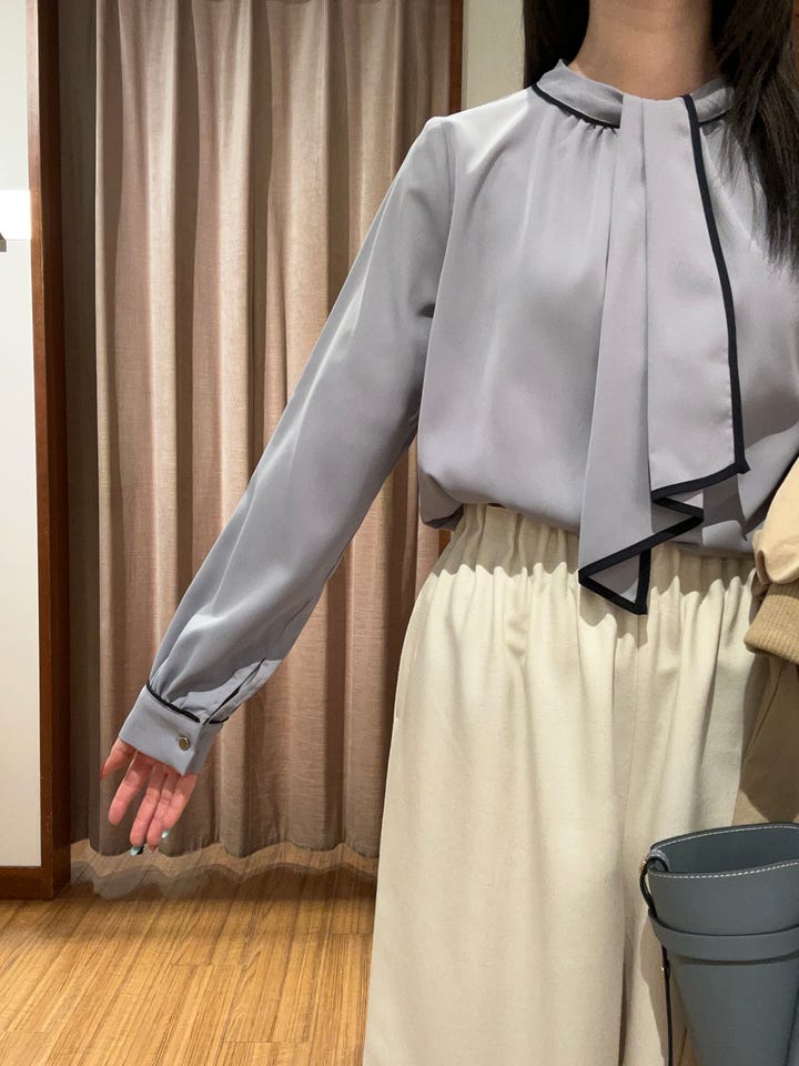 取り外し可能なボウタイがついたブラウスです。透け感はないため一枚で着用できます。