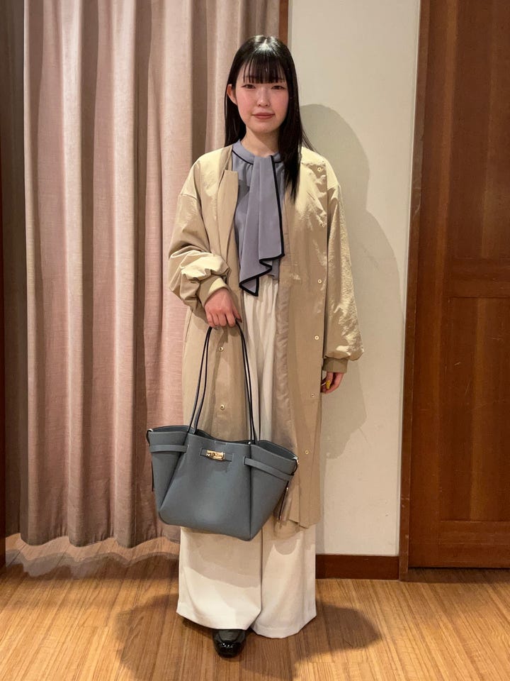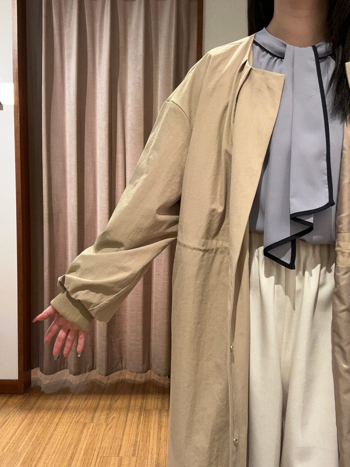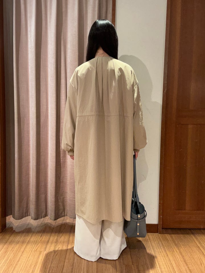 お仕事でもプライベートでも着用できる薄めのアウターです。膝下ぐらいの丈感です。