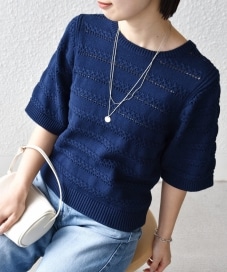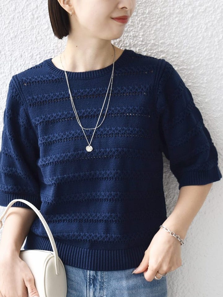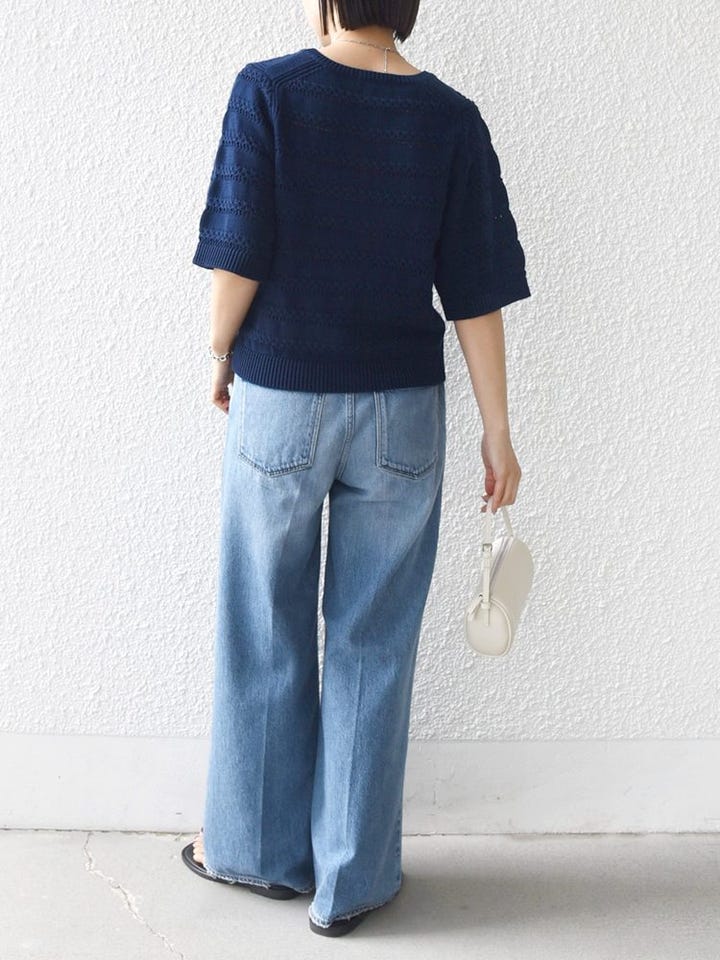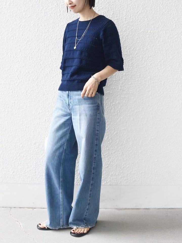 着心地:ニット特有の重さがなく、軽やかで涼しい着心地。透け感も控えめなので、インナーを気にしすぎずデイリーに使いやすいです。