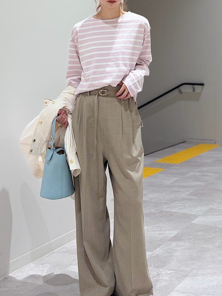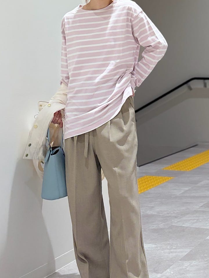 【素材感・着心地】ベーシックなボーダーのロングTシャツ。インナーにも一枚でも腰巻きにしてポイント使いにも一枚万能なロンTです!首元はボートネックで上品な印象。