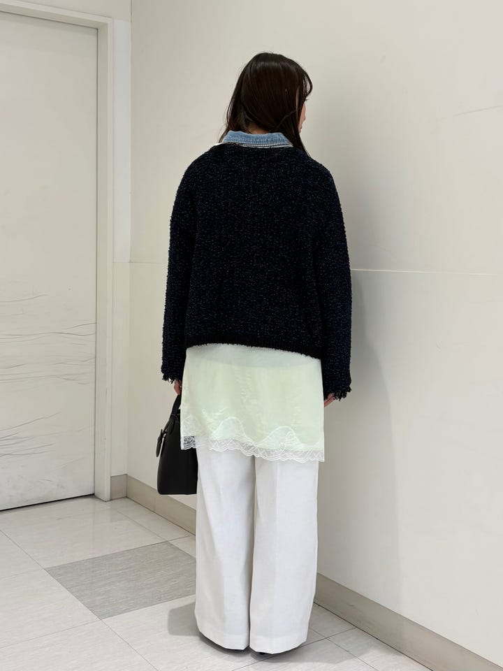 麻混の涼しげな印象ですが、ポリエステルも入っているためシワになりにくく、春?秋にかけて長いシーズン使えます!シルエットがワイドすぎないため、綺麗めな印象にも使えます◎