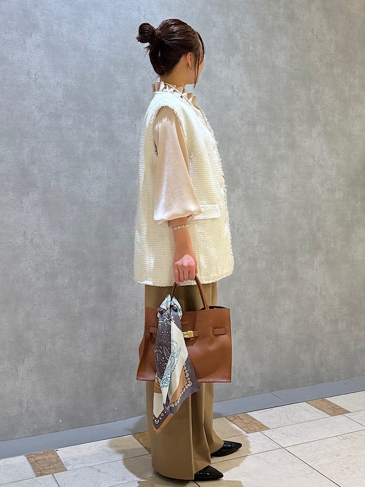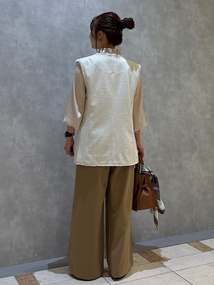 着用感 : 羽織るだけでコーディネイトがぐんとお洒落見えするツイードジレです。ゴールドのラメ糸が繊細に編み込まれているので、上品ながら華やかさがあります。