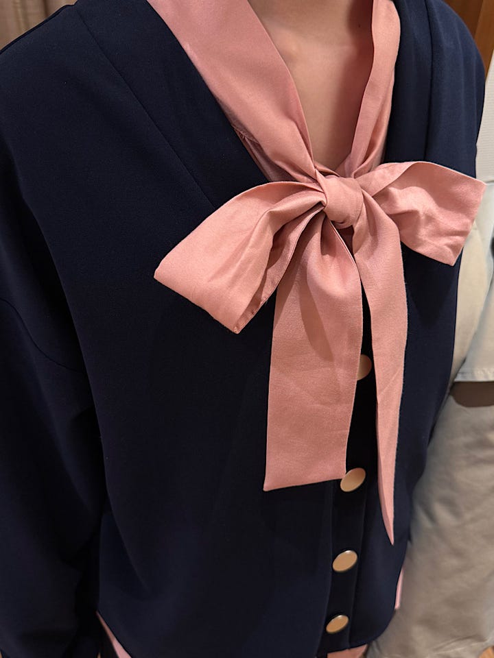 着心地:シアー感のあるボウタイブラウスです。