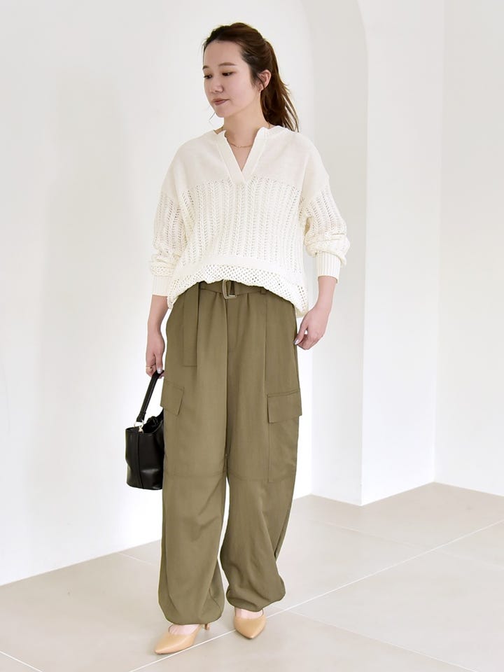ざっくりとした透かし編みニットにカーゴパンツを合わせた、程よく力の抜けた大人カジュアルスタイル。
