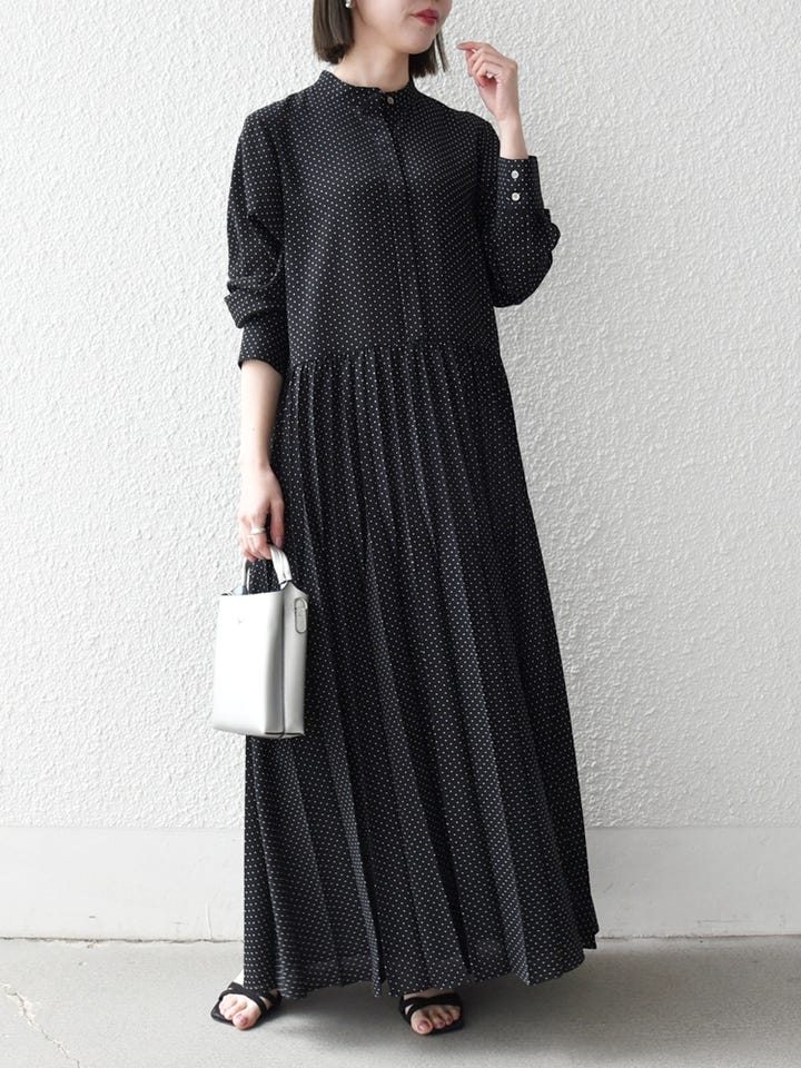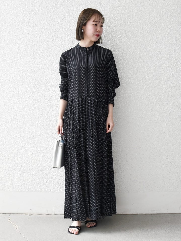 着用アイテム:SHIPS any:〈手洗い可能〉ドット バンドカラー プリーツ ロング ワンピース ブラック