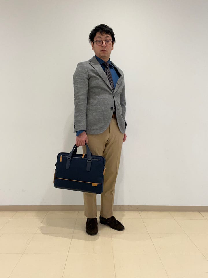 着心地:軽い羽織り心地と凹凸感のある素材感でシワにもなりにくいです。ビジネス、カジュアル兼用。