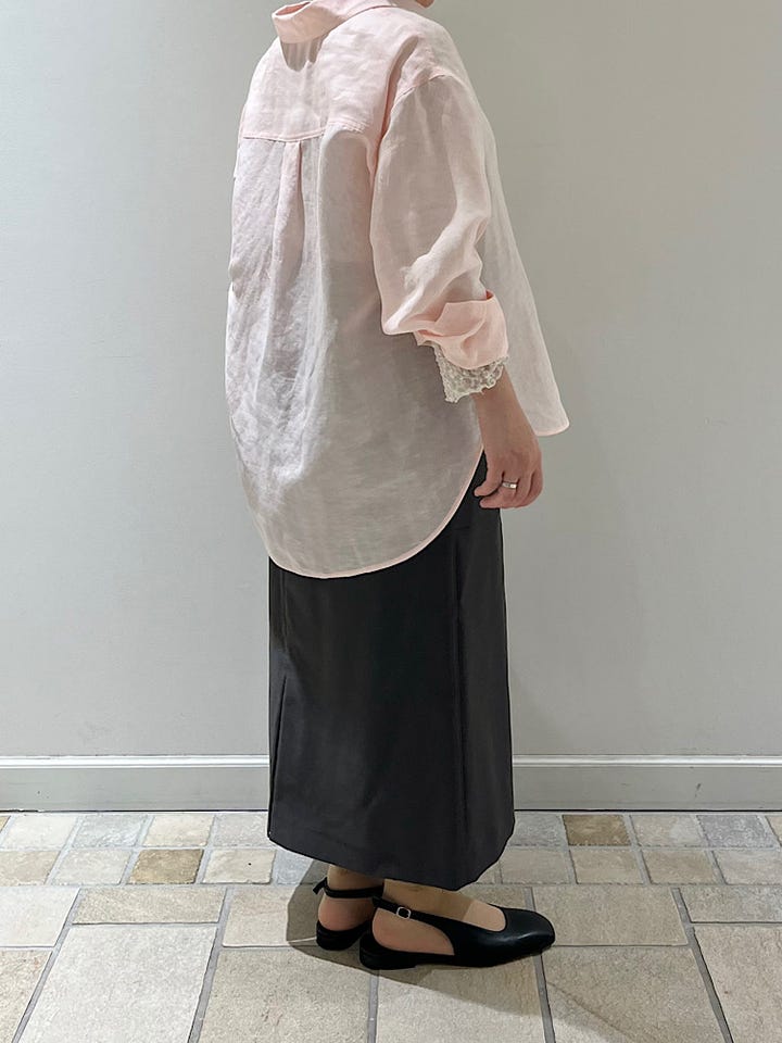 着心地:広がりすぎないシルエットで綺麗めな印象。リネン混かつポリエステルが多く入っているため涼しげながらもシワが気になりにくいです。