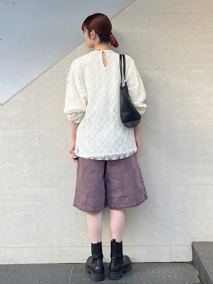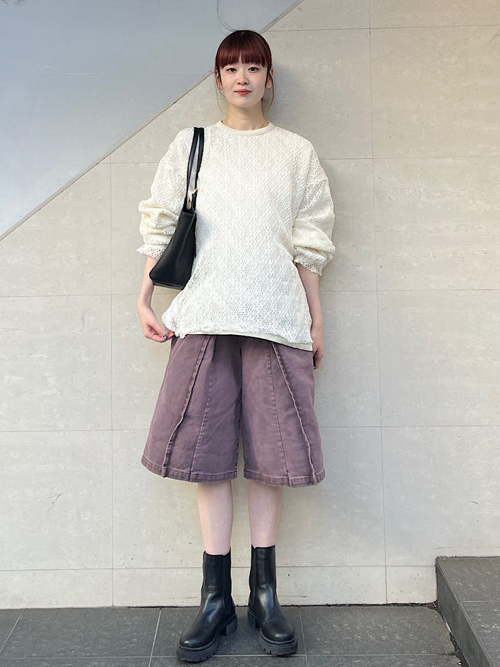 着心地:デザインの効いたコーデの主役になります。色も形も他にない気分の上がるアイテムです。ウエスト部分のボタンも可愛いので注目です。
