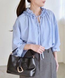 〔ONE SIZE〕quaranciel:〈洗濯機可能〉フリルカラー リボン ギャザースリーブ ブラウス