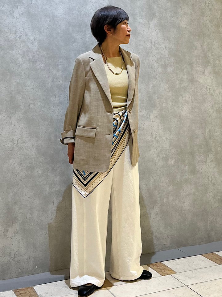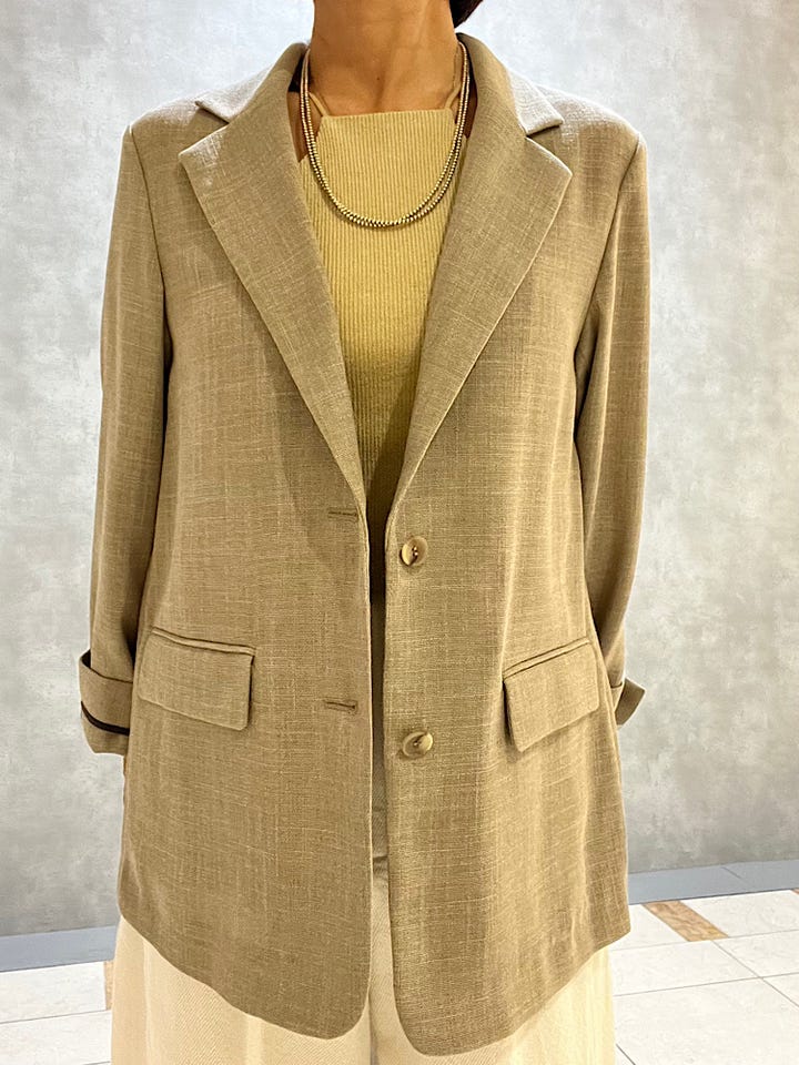 着用感 : 麻の様な軽い着心地で裏地無しなのでサラッと羽織るには良いです。シングルのデザインも通勤やオフの日などインナーもシャツやブラウスなど手持ちのアイテムともコーディネイトしやすいです。