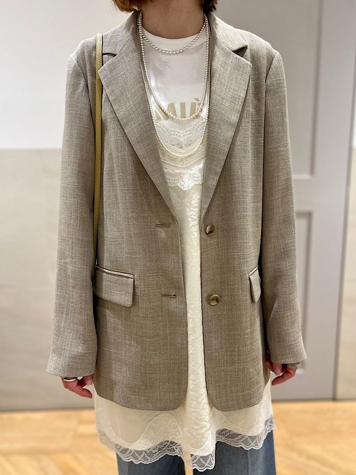 麻見えするベイシックなテーラードジャケットで、シルエットが綺麗です◎シワになりづらく、カジュアルでもドレススタイリングでも活躍する定番アイテムです!