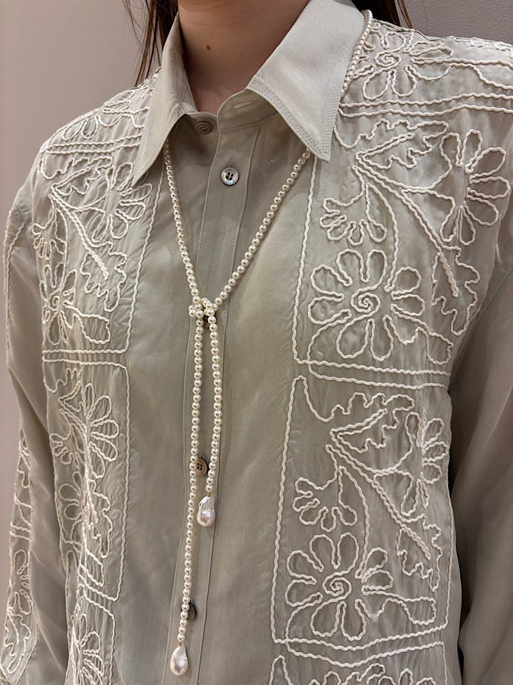 色味ベージュですが、実際はライトグリーンっぽく見えます。透け感もあり、ヴィンテージっぽいお花の刺繍が可愛いらしいアイテムです!