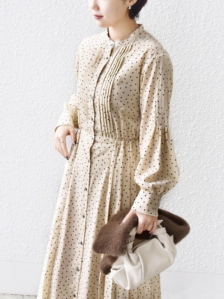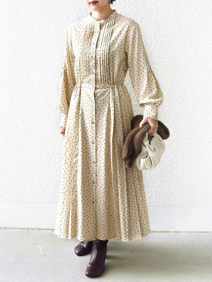 〔SMALL〕〈手洗い可能〉ドット / 花柄 バンドカラー サイド プリーツ ワンピース