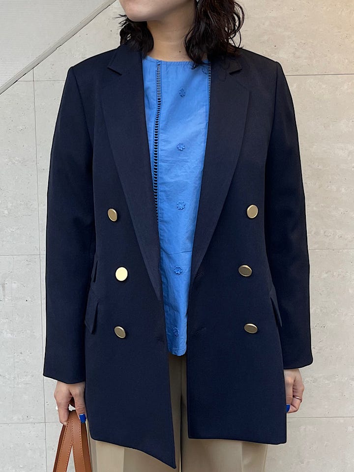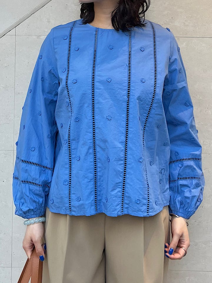 昨年も人気のブラウスの新色です!着丈はジャストで長すぎず、ボトムスのバランスもとりやすいです。フレアのスカートや、ワイドパンツ、デニムなどシンプルなもので合わせるのがおすすめです。