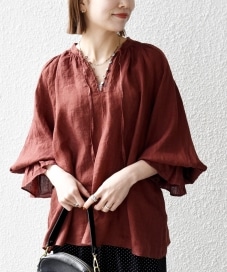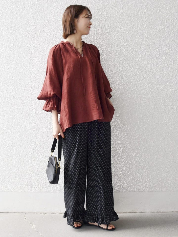 着用アイテム:リネン ボリューム スリーブ フレア ブラウス ブラウン