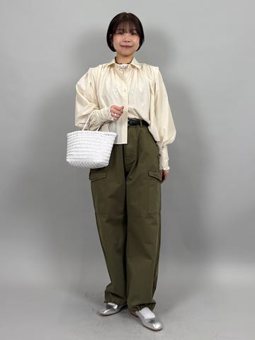 素材感・着心地:薄手でハリがあるポリエステル素材で、着るだけで様になるブラウス。