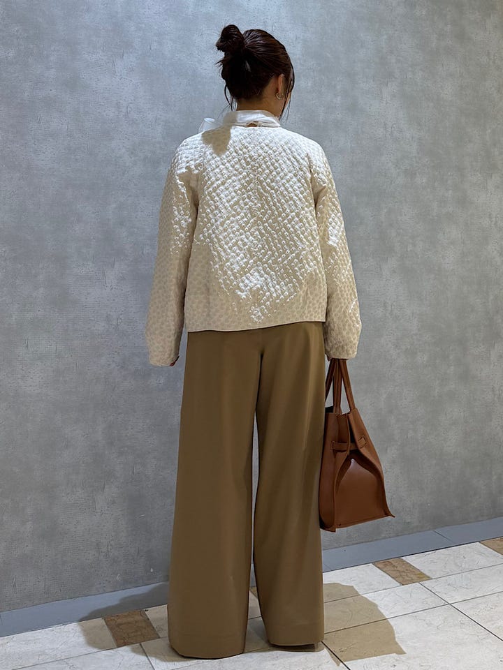 着用感 : 締め付け感が全くなく、着心地抜群のイージーパンツです。ウエストはゴム仕様のためデスクワークなどでも楽に着用できます。とろみのある滑らかな生地感なので綺麗めな印象になります。