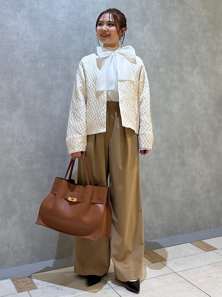着用感 : 胸元のリボンがポイントのブラウスです。リボンは前後どちらでも結んでいただけます。ホワイトの色味は清潔感があるので、幅広いシーンでご着用いただけます。