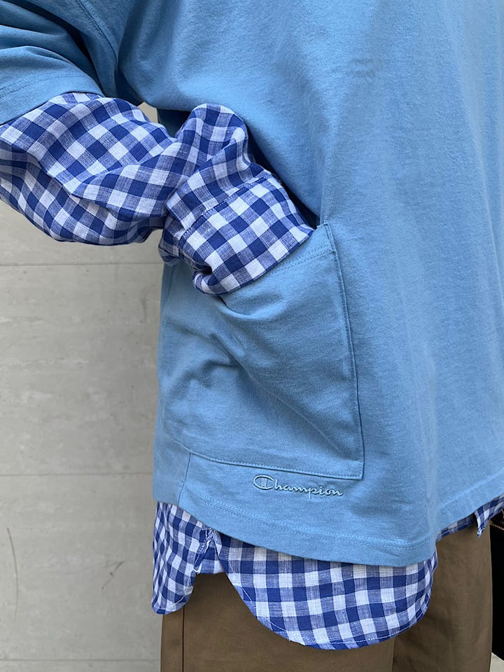 ◆ 商品名: Champion:ロゴ刺繍ドルマンキャンプポケットTシャツ